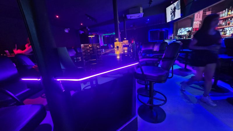 Dans un décor sombre éclairé par des néons bleus, l’endroit est spacieux, avec de confortables banquettes et une ambiance feutrée. C’est un gentleman’s club élégant, avec un personnel accueillant et une atmosphère détendue. L’espace permet de profiter d’un certain niveau d’intimité, notamment grâce à des rideaux pouvant être tirés. On y trouve également un billard pour se divertir, et les consommations restent très abordables : par exemple, environ 50 THB pour un soda. J’apprécie particulièrement cet endroit pour son ambiance agréable. La musique n’est pas trop forte, ce qui en fait un lieu idéal pour venir entre amis, avant ou après le dîner, simplement pour se détendre.
